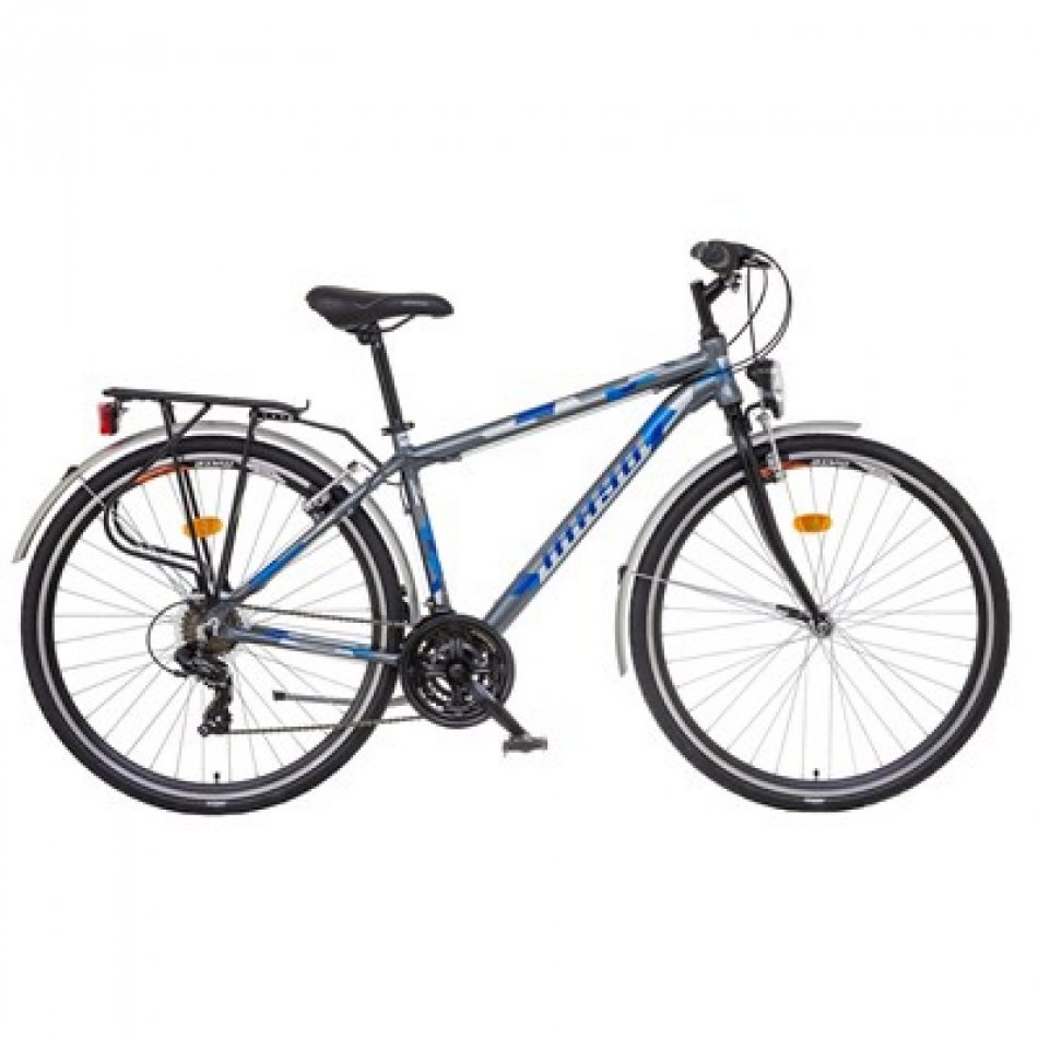 Trekkingový bicykel s rámom zo zliatiny hliníka Al-6061 so zohnutou spodnou rúrou, 18 prevodov, komponenty SHIMANO TOURNEY, radenie SHIIMANO REVOSHIFT, kľuky PROWHEEL, JOYTECH AL náboje, brzdy V-Brake, spevnené DOUBLEWALL ráfiky MATE DWR20V, kompletná výbava na cestnú prevádzku - blatníky RPZ so vzperami, nosič so záklopom, LED osvetlenie, stojan. Rám: Aluminium AL6061, TIG welding, down tube bended Bi-Axial shape, top tube UNI-Style bended shape, S-Type seat stays, integrated Ahead headparts Vidlica: Hi-TEN steel pevná Zadný menič: SHIMANO TY-300Predný menič: SHIMANO FD-TZ31Radenie: SHIMANO RS-35 REVO 3x6Viackolo: SHIMANO MF-TZ20Reťaz: INDEX 6/7spdKľuky: STEEL 48/38/28Počet prevodov: 18 Predný náboj: JOYTECH AL DISCZadný náboj: JOYTECH AL DISCRáfiky: M.A.T.E. DWR-20VPlášte: MITAS HOOK 700x35CVýplet: Pozink CZ 2,0mmBrzdy: SACCON FV-951 V-BRAKE Riadidlá: Steel RaisedPredstavec: Steel 25,4mmSedlovka: Steel 27,2/300mmSedlo: M.A.T.E. BASICRukoväte: Herrmans MOZA 90mmPedále: Plastic body / Steel cage Doplnky: blatníky RPZ so vzperami, oceľový nosič, LED osvetlenie, stojan Hmotnosť: 14,9kg