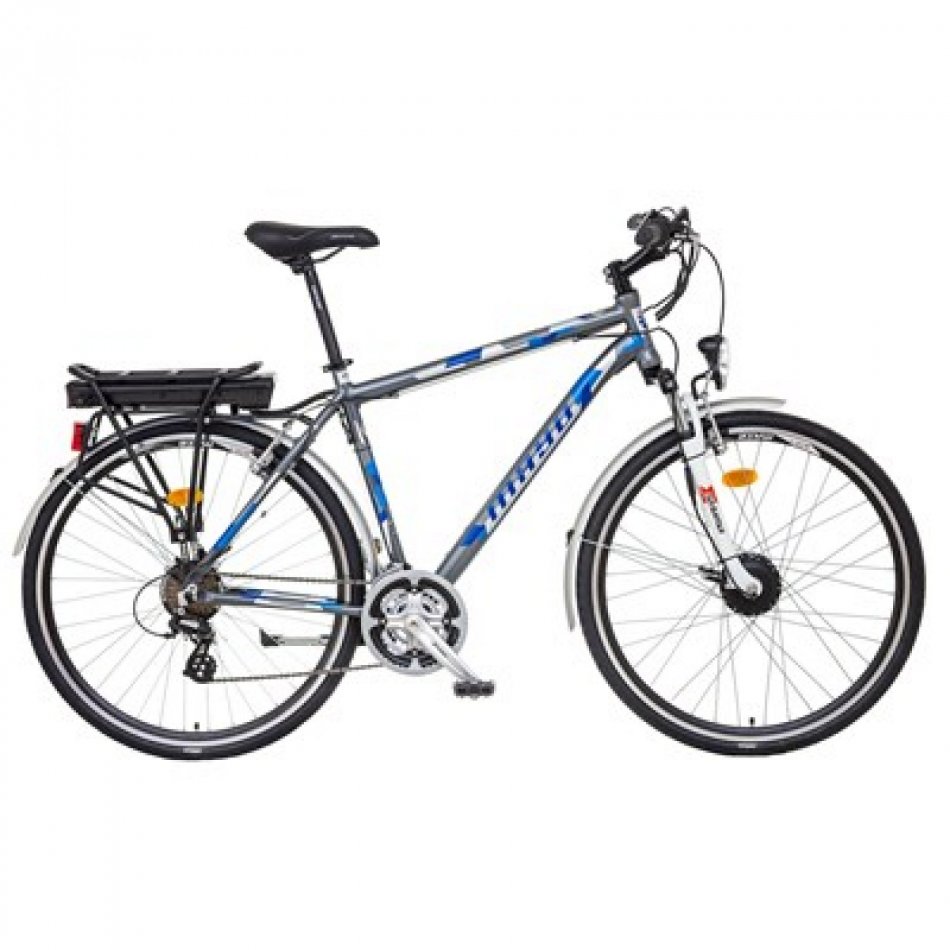 Trekkingový bicykel s pomocným elektrickým motorom v prednom náboji, akumulátorom v zadnom nosiči, LCD displejom s ukazovateľom cyklofunkcií, ovládaním na riadidlách v šiestich úrovniach. Bicykel je osadený radiacim systémom SHIMANO TOURNEY s 21 prevodmi, V-Brake brzdami a je kompletne vybavený na cestnú prevádzku. Umožňuje prevádzku na asfaltových aj spevnených lesných cestách. Preto je mimoriadne vhodný na rekreačnú cykloturistiku aj pre ľudí so slabšou telesnou kondíciou. Dojazd bicykla je 30-80 km na jedno nabitie v závislosti na profile trate, hmotnosti jazdca, ako aj nastaveného stupňa podpory. K elektrobicyklu je možné doobjednať funkciu START-UP asistent, ktorá umožňuje pohon bicykla do 6km/h aj bez otáčania pedálov, aktivuje sa stlačením tlačidla na ovládacom paneli a umožňuje pohodlný rozbeh bicykla, ako aj pomoc pri tlačení bicykla do strmého kopca. Bicykel vyhovuje norme STN EN 15 194, tzn. že je možné ho prevádzkovať na pozemných komunikáciach bez potreby vodičského oprávnenia. Ovládanie bicykla je veľmi jednoduché, akonáhle začne jazdec otáčať pedálmi smerom vpred, pohybový senzor spustí motor a podľa nastaveného stupňa podpory dávkuje energiu do motora, čím jazdcovi výrazne pomáha pri jazde. Po rovine je možné udržiavať bicykel v jadzde iba pomalým otáčaním pedálov tak, aby snímač pohybu pedálov nepretržite udržiaval motor v prevádzke. Max. rýchlosť sa dá ovplyvniť nastavením vhodného stupňa podpory od cca 15km/h až do max. rýchlosti 25km/h v šiestich stupňoch. Pri jazde do kopca elektromotor výrazne jazdcovi pomáha prekonať stúpanie, pri strmších stúpaniach je však potrebné dodávať energiu šliapaním do pedálov, aj keď vo výrazne menšej miere ako na bežnom bicykli. Dojazd bicykla závisí od viacerých faktorov, ako napr. výškového profilu trate, hmotnosti jazdca a jeho podpory, nastaveného stupňa podpory, poveternostných podmienok a pod. Bicykel nie je vhodné používať na mokrej vozovke, za dažďa, alebo v snehovej kalamite. Pri teplote pod 5°C sa kapacita akumulátora znížuje o cca 20%. Akumulátor sa nabíja dodávanou automatickou nabíjačkou, pričom dobíjací cyklus trvá max. 7 hodín (pri úplnom vybití). Pri prevádzke bicykla je vhodné dobíjať akumulátor čo najčastejšie, časté hlboké vybíjanie má za následok zníženie jeho životnosti. Ideálne je dobiť akumulátor po každej jazde, alebo v prípade krátkych úsekov jazdy vždy keď úroveň nabitia klesne pod 50%. Akumulátor je možné nabíjať priamo na bicykli, alebo aj oddelene. K cene je účtovaný recyklačný poplatok /RP/ v zmysle §32 ods.5 zákona č. 79/2015 Zb. z. o odpadoch vo výške 4,80€ bez DPH/5,76€ s DPH.