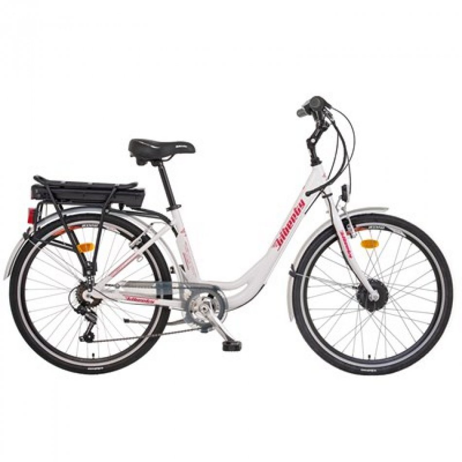 Mestský bicykel v 26" prevedení s pomocným elektrickým motorom v prednom náboji a šiestimi prevodmi. Dojazd bicykla je cca 20-60 km na jedno nabitie, v závislosti od profilu trate, hmotnosti jazdca, jeho podpory a nastaveného stupňa podpory, poveternostných podmienok, a podobne. Má tri stupne podpory motora s ovládaním na riadidlách, Li-Ion akumulátor 36V/10,4Ah. Konštrukcia bicykla je vhodná pre dámy aj pánov s výškou do 175-180cm (nad 175cm treba zvážiť model e-STRADA, ktorý je vhodnejší pre osoby vyššieho vzrastu). K elektrobicyklu je možné doobjednať funkciu START-UP asistent, ktorá umožňuje pohon bicykla do 6km/h aj bez otáčania pedálov, aktivuje sa stlačením tlačidla na ovládacom paneli a umožňuje pohodlný rozbeh bicykla a pomoc pri tlačení bicykla do strmého kopca. Bicykel vyhovuje norme STN EN 15 194, tzn. že je možné ho prevádzkovať na pozemných komunikáciach bez potreby vodičského oprávnenia a akýchkoľvek iných dokladov. Ovládanie bicykla je veľmi jednoduché, akonáhle začne jazdec otáčať pedálmi smerom vpred, pohybový senzor spustí motor a podľa nastaveného stupňa podpory dávkuje energiu do motora, čím jazdcovi výrazne pomáha pri jazde. Po rovine je možné udržiavať bicykel v jadzde iba pomalým otáčaním pedálov tak, aby snímač pohybu pedálov nepretržite udržiaval motor v prevádzke. Max. rýchlosť sa dá ovplyvniť nastavením vhodného stupňa podpory od cca 15km/h až do max. rýchlosti 25km/h v troch stupňoch. Pri jazde do kopca elektropohon výrazne jazdcovi pomáha prekonať stúpanie, pri strmších stúpaniach je však potrebné dodávať energiu šliapaním do pedálov, aj keď vo výrazne menšej miere ako na bežnom bicykli. Bicykel nie je vhodné používať na mokrej vozovke, za dažďa alebo v snehovej kalamite. Akumulátor sa nabíja dodávanou automatickou nabíjačkou, pričom dobíjací cyklus trvá max. 7 hodín (pri jeho úplnom vybití). K cene je účtovaný recyklačný poplatok /RP/ v zmysle §32 ods.5 zákona č. 79/2015 Zb. z. o odpadoch vo výške 4,80€ bez DPH/5,76€ s DPH.