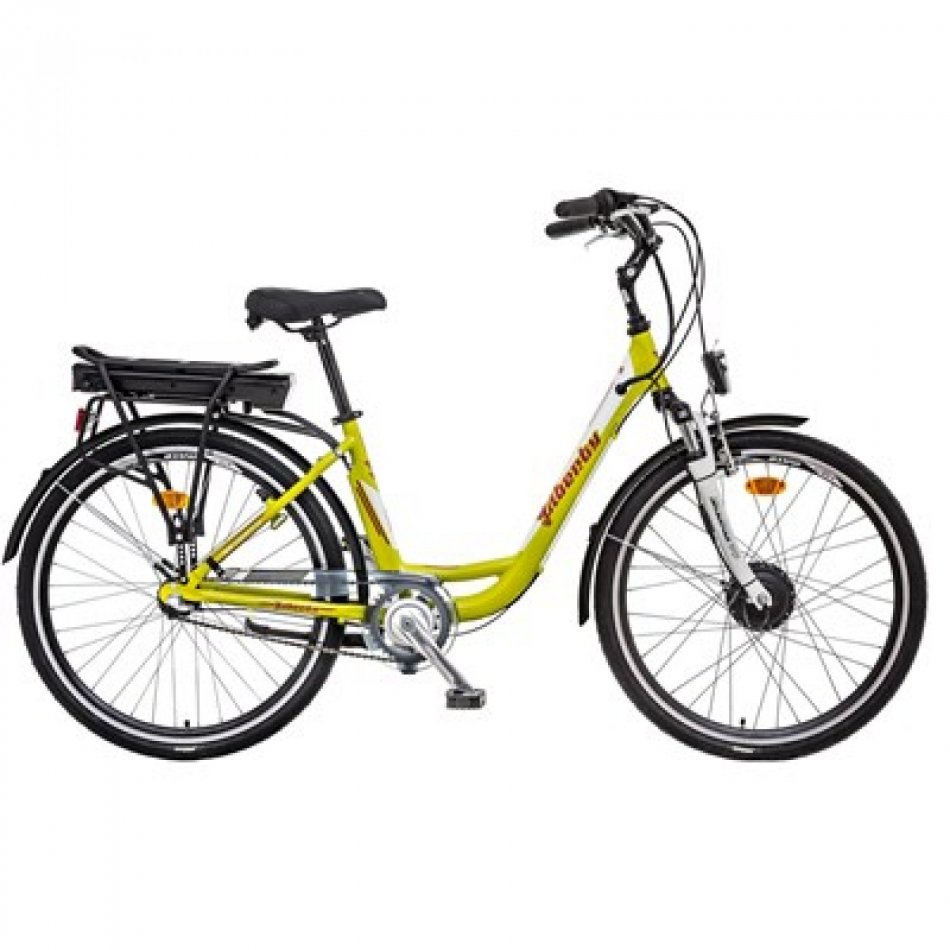 Mestský bicykel v 26" prevedení s pomocným elektrickým motorom v prednom náboji a 3-rýchlostným zadným nábojom s protišľapnou brzdou. Dojazd bicykla je cca 20-60 km na jedno nabitie v závislosti od profilu trate, hmotnosti jazdca, jeho podpory a nastaveného stupňa podpory, poveternostných podmienok, a podobne. Má tri stupne podpory motora s ovládaním na riadidlách, Li-Ion akumulátor 36V/10Ah. Rám je vyrobený zo zliatiny hliníka AL-6061, čo výrazne znižuje hmotnosť bicykla. Konštrukcia bicykla je vhodná pre dámy aj pánov s výškou do 175-180cm (nad 175cm treba zvážiť model e-STRADA, ktorý je vhodnejší pre osoby vyššieho vzrastu). K elektrobicyklu je možné doobjednať funkciu START-UP asistent, ktorá umožňuje pohon bicykla do 6km/h aj bez otáčania pedálov, aktivuje sa stlačením tlačidla na ovládacom paneli a umožňuje pohodlný rozbeh bicykla a pomoc pri tlačení bicykla do strmého kopca. Bicykel vyhovuje norme STN EN 15 194, tzn. že je možné ho prevádzkovať na pozemných komunikáciach bez potreby vodičského oprávnenia a akýchkoľvek iných dokladov. Ovládanie bicykla je veľmi jednoduché, akonáhle začne jazdec otáčať pedálmi smerom vpred, pohybový senzor spustí motor a podľa nastaveného stupňa podpory dávkuje energiu do motora, čím jazdcovi výrazne pomáha pri jazde. Po rovine je možné udržiavať bicykel v jadzde iba pomalým otáčaním pedálov tak, aby snímač pohybu pedálov nepretržite udržiaval motor v prevádzke. Max. rýchlosť sa dá ovplyvniť nastavením vhodného stupňa podpory od cca 15km/h až do max. rýchlosti 25km/h v troch stupňoch. Pri jazde do kopca elektropohon výrazne jazdcovi pomáha prekonať stúpanie, pri strmších stúpaniach je však potrebné dodávať energiu šliapaním do pedálov, aj keď vo výrazne menšej miere ako na bežnom bicykli. Bicykel nie je vhodné používať na mokrej za dažďa, alebo v snehovej kalamite. K cene je účtovaný recyklačný poplatok /RP/ v zmysle §32 ods.5 zákona č. 79/2015 Zb. z. o odpadoch vo výške 4,80€ bez DPH/5,76€ s DPH.