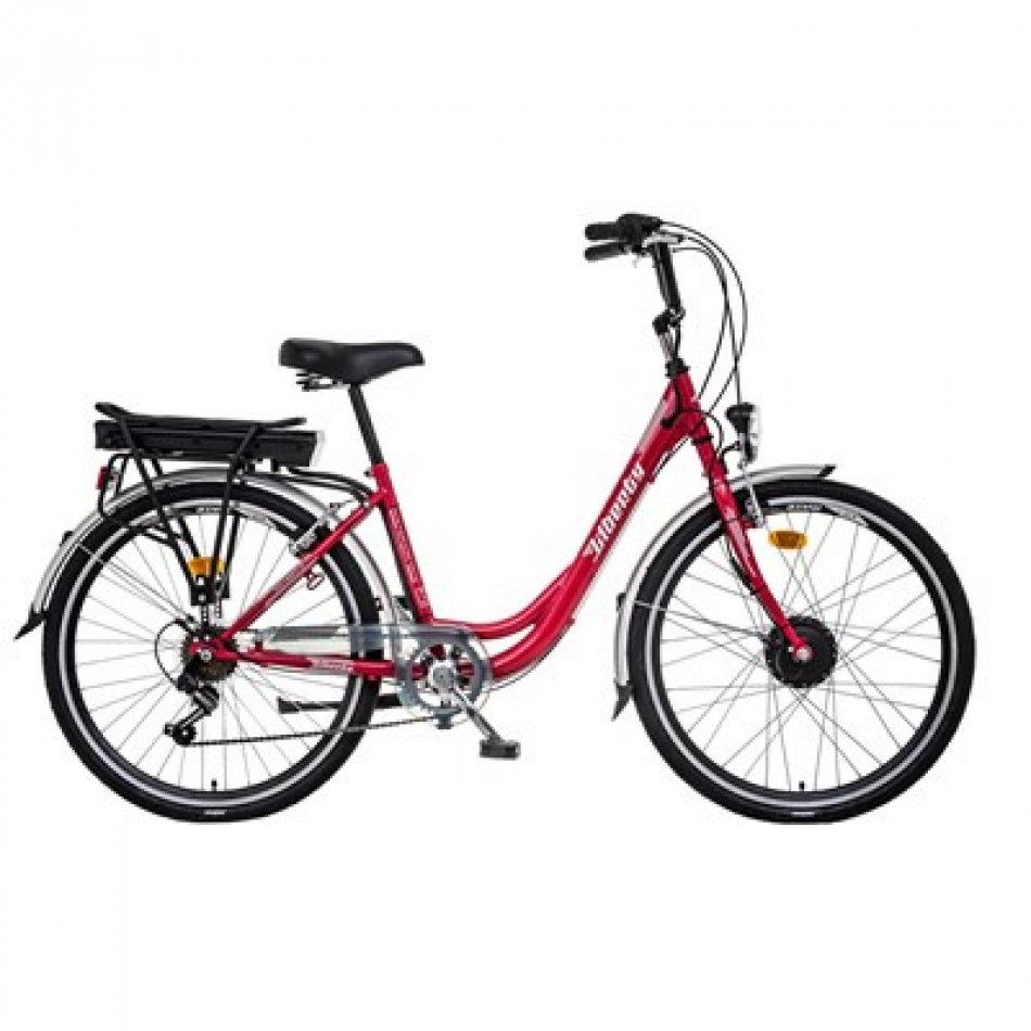 Mestský bicykel so zníženým a spevneným oceľovým rámom v šesťrýchlostnom prevedení. Bicykel je vybavený elektrickým motorom 36V/250W v prednom náboji, ovládacím LED panelom na riadidlách, akumulátorom v zadnom nosiči a max. rýchlosťou 25km/hod. Bicykel vyhovuje norme STN EN 15 194, tzn. že je možné ho prevádzkovať na pozemných komunikáciach bez potreby vodičského oprávnenia a akýchkoľvek iných dokladov. Ovládanie bicykla je veľmi jednoduché - akonáhle začne jazdec otáčať pedálmi smerom vpred, pohybový senzor spustí motor a podľa nastaveného stupňa podpory dávkuje energiu do motora, čím jazdcovi výrazne pomáha pri jazde. Po rovine je možné udržiavať bicykel v jadzde iba pomalým otáčaním pedálov tak, aby snímač pohybu pedálov nepretržite udržiaval motor v prevádzke. Max. rýchlosť sa dá ovplyvniť nastavením vhodného stupňa podpory od cca 15km/h až do max. rýchlosti v troch stupňoch. Pri jazde do kopca elektropohon výrazne jazdcovi pomáha prekonať stúpanie, pri strmších stúpaniach je však potrebné dodávať energiu šliapaním do pedálov, aj keď vo výrazne menšej miere ako na bežnom bicykli. Dojazd bicykla /20-60km/ závisí od viacerých faktorov a to napr. výškového profilu trate, hmotnosti jazdca a jeho podpory, nastaveného stupňa podpory motora, poveternostných podmienok a pod. Bicykel nie je vhodné používať na mokrej vozovke, za dažďa, alebo v snehovej kalamite. Akumulátor sa nabíja dodávanou automatickou nabíjačkou, pričom dobíjací cyklus trvá max. 7 hodín (pri úplnom vybití akumulátora). Ideálne je dobiť akumulátor po každej jazde, alebo v prípade krátkych úsekov vždy keď úroveň nabitia klesne pod 50%. Akumulátor je možné nabíjať priamo na bicykli, alebo oddelene. V prípade dlhodobého uskladnenia je potrebné akumulátor nabiť iba na cca 50-60% kapacity a udržiavať ho v teplotnom rozsahu 15-20°C.K cene je účtovaný recyklačný poplatok /RP/ v zmysle §32 ods. 5 zákona č. 79/2015 Z. z. o odpadoch vo výške 4,80€ bez DPH/5,76€ s DPH.
