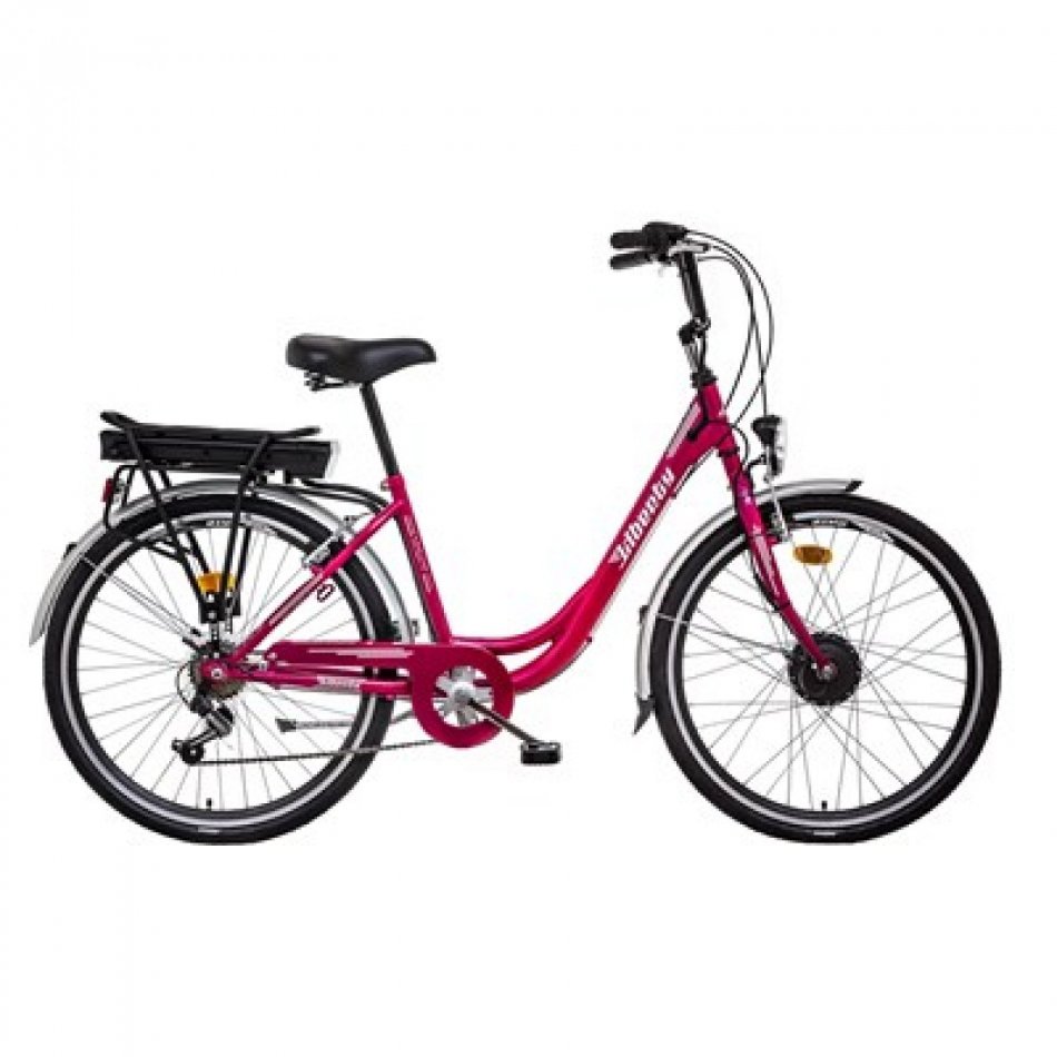 Mestský bicykel so zníženým a spevneným oceľovým rámom v šesťrýchlostnom prevedení. Bicykel je vybavený elektrickým motorom 36V/250W v prednom náboji, ovládacím LED panelom na riadidlách, akumulátorom v zadnom nosiči a max. rýchlosťou 25km/hod. Bicykel vyhovuje norme STN EN 15 194, tzn. že je možné ho prevádzkovať na pozemných komunikáciach bez potreby vodičského oprávnenia a akýchkoľvek iných dokladov. Ovládanie bicykla je veľmi jednoduché - akonáhle začne jazdec otáčať pedálmi smerom vpred, pohybový senzor spustí motor a podľa nastaveného stupňa podpory dávkuje energiu do motora, čím jazdcovi výrazne pomáha pri jazde. Po rovine je možné udržiavať bicykel v jadzde iba pomalým otáčaním pedálov tak, aby snímač pohybu pedálov nepretržite udržiaval motor v prevádzke. Max. rýchlosť sa dá ovplyvniť nastavením vhodného stupňa podpory od cca 15km/h až do max. rýchlosti v troch stupňoch. Pri jazde do kopca elektropohon výrazne jazdcovi pomáha prekonať stúpanie, pri strmších stúpaniach je však potrebné dodávať energiu šliapaním do pedálov, aj keď vo výrazne menšej miere ako na bežnom bicykli. Dojazd bicykla /20-60km/ závisí od viacerých faktorov a to napr. výškového profilu trate, hmotnosti jazdca a jeho podpory, nastaveného stupňa podpory motora, poveternostných podmienok a pod. Bicykel nie je vhodné používať na mokrej vozovke, za dažďa, alebo v snehovej kalamite. Akumulátor sa nabíja dodávanou automatickou nabíjačkou, pričom dobíjací cyklus trvá max. 7 hodín (pri úplnom vybití akumulátora). Ideálne je dobiť akumulátor po každej jazde, alebo v prípade krátkych úsekov vždy keď úroveň nabitia klesne pod 50%. Akumulátor je možné nabíjať priamo na bicykli, alebo oddelene. V prípade dlhodobého uskladnenia je potrebné akumulátor nabiť iba na cca 50-60% kapacity a udržiavať ho v teplotnom rozsahu 15-20°C.K cene je účtovaný recyklačný poplatok /RP/ v zmysle §32 ods. 5 zákona č. 79/2015 Z. z. o odpadoch vo výške 4,80€ bez DPH/5,76€ s DPH.