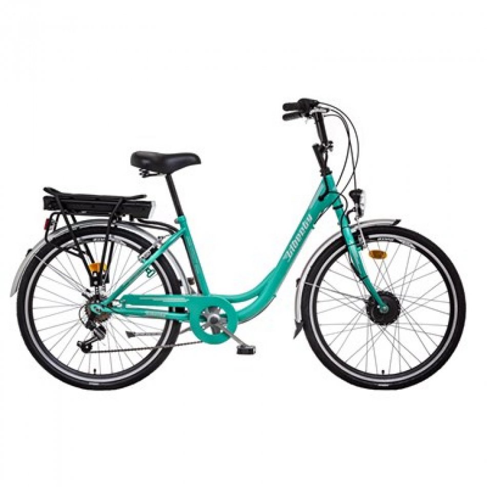 Mestský bicykel so zníženým a spevneným oceľovým rámom v šesťrýchlostnom prevedení. Bicykel je vybavený elektrickým motorom 36V/250W v prednom náboji, ovládacím LED panelom na riadidlách, akumulátorom v zadnom nosiči a max. rýchlosťou 25km/hod. Bicykel vyhovuje norme STN EN 15 194, tzn. že je možné ho prevádzkovať na pozemných komunikáciach bez potreby vodičského oprávnenia a akýchkoľvek iných dokladov. Ovládanie bicykla je veľmi jednoduché - akonáhle začne jazdec otáčať pedálmi smerom vpred, pohybový senzor spustí motor a podľa nastaveného stupňa podpory dávkuje energiu do motora, čím jazdcovi výrazne pomáha pri jazde. Po rovine je možné udržiavať bicykel v jadzde iba pomalým otáčaním pedálov tak, aby snímač pohybu pedálov nepretržite udržiaval motor v prevádzke. Max. rýchlosť sa dá ovplyvniť nastavením vhodného stupňa podpory od cca 15km/h až do max. rýchlosti v troch stupňoch. Pri jazde do kopca elektropohon výrazne jazdcovi pomáha prekonať stúpanie, pri strmších stúpaniach je však potrebné dodávať energiu šliapaním do pedálov, aj keď vo výrazne menšej miere ako na bežnom bicykli. Dojazd bicykla /20-60km/ závisí od viacerých faktorov a to napr. výškového profilu trate, hmotnosti jazdca a jeho podpory, nastaveného stupňa podpory motora, poveternostných podmienok a pod. Bicykel nie je vhodné používať na mokrej vozovke, za dažďa, alebo v snehovej kalamite. Akumulátor sa nabíja dodávanou automatickou nabíjačkou, pričom dobíjací cyklus trvá max. 7 hodín (pri úplnom vybití akumulátora). Ideálne je dobiť akumulátor po každej jazde, alebo v prípade krátkych úsekov vždy keď úroveň nabitia klesne pod 50%. Akumulátor je možné nabíjať priamo na bicykli, alebo oddelene. V prípade dlhodobého uskladnenia je potrebné akumulátor nabiť iba na cca 50-60% kapacity a udržiavať ho v teplotnom rozsahu 15-20°C.K cene je účtovaný recyklačný poplatok /RP/ v zmysle §32 ods. 5 zákona č. 79/2015 Z. z. o odpadoch vo výške 4,80€ bez DPH/5,76€ s DPH.